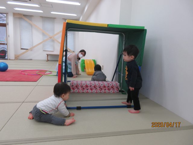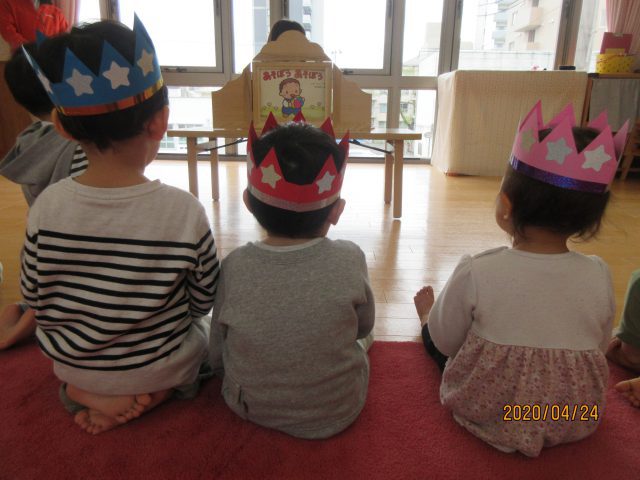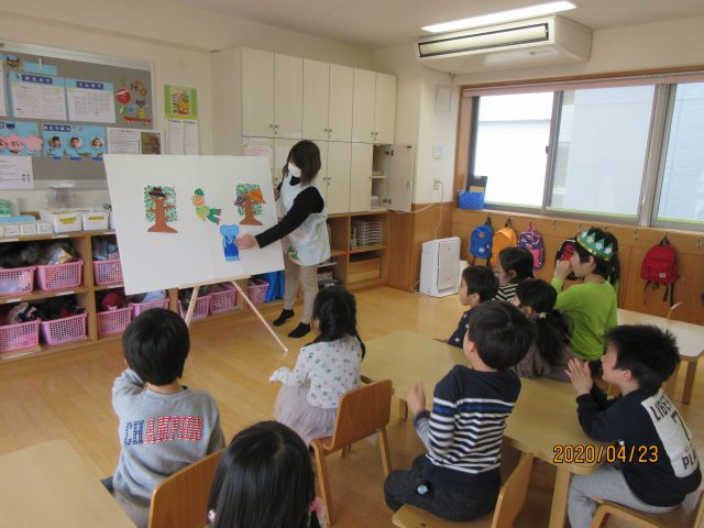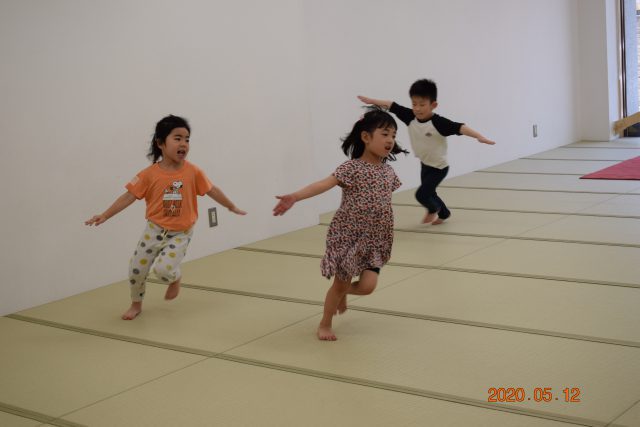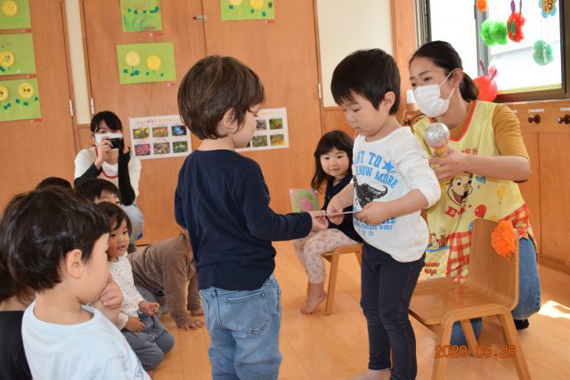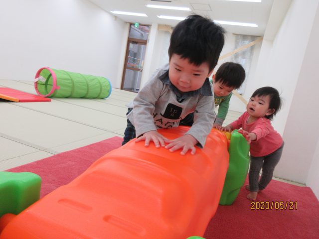 新型コロナウイルス感染拡大により、保育活動が制限され戸外遊びや散歩ができない期間が続いていました。その中でも保育室・ホール・園駐車場などで工夫しながら様々な保育活動を行っていましたので、各クラスの保育の一場面を紹介します。