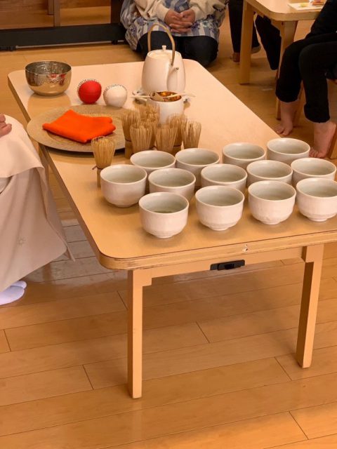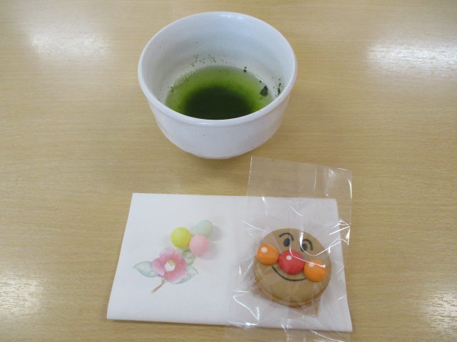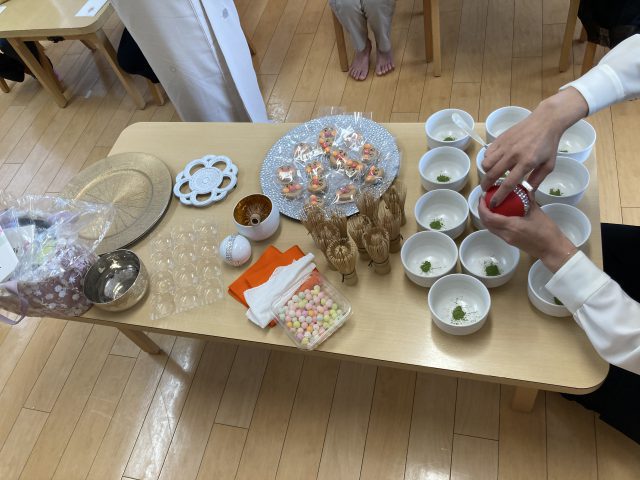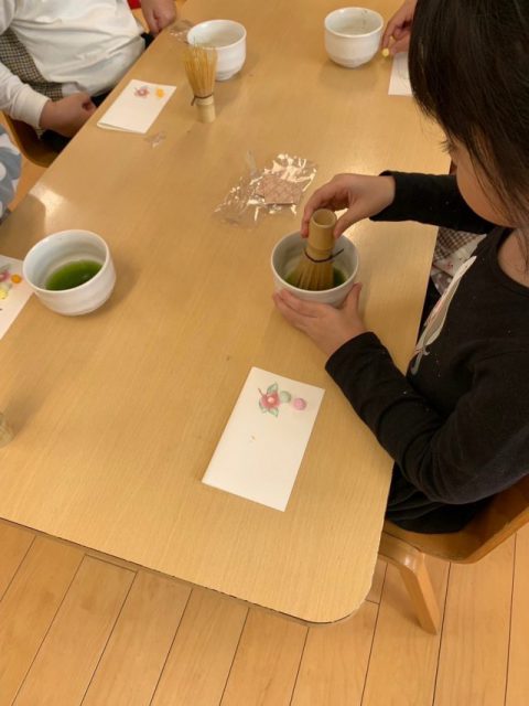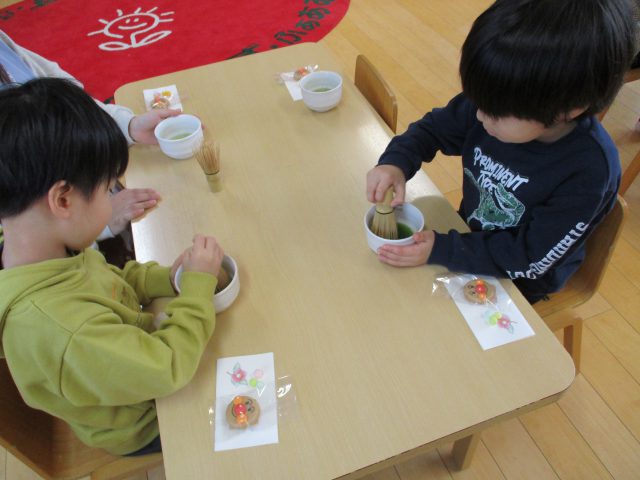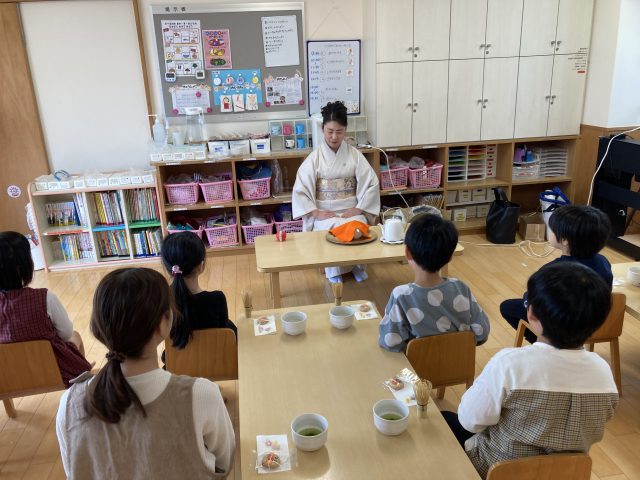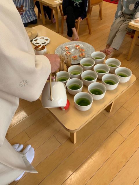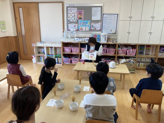 子ども達は初めての体験に期待でいっぱいの様子でした。実際にお茶を立ててもらったり、アンパンマンの可愛いお菓子を食べたりしながら、作法を教えてもらいました。また絵本を通して食の有難さも教えてもらいました。みんな真剣な表情で田村先生の話を聞いたり、立てていただいたお茶を「美味しいね」と言いながら体験を楽しむことが出来ました。